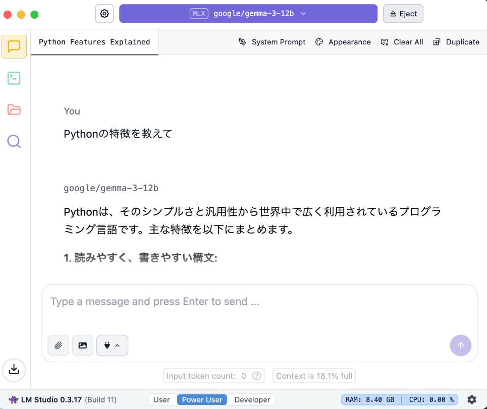 早速、試しにPythonについて聞いてみました。遅すぎるわけでもなく、けっこう普通に使えています!!